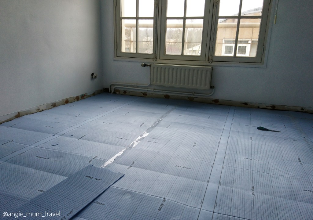 Là aussi, beaucoup de travail. Il a fallu enlever le parquet existant, en mauvais état, causé sans doute par un dégât des eaux, puis la moquette hideuse, arrachée à la main, aidé par mes deux p’tits monstres. Une fois le sol nettoyé, le parquet a été posé sur une sous-couche phonique, sur le sol nouvellement nu.